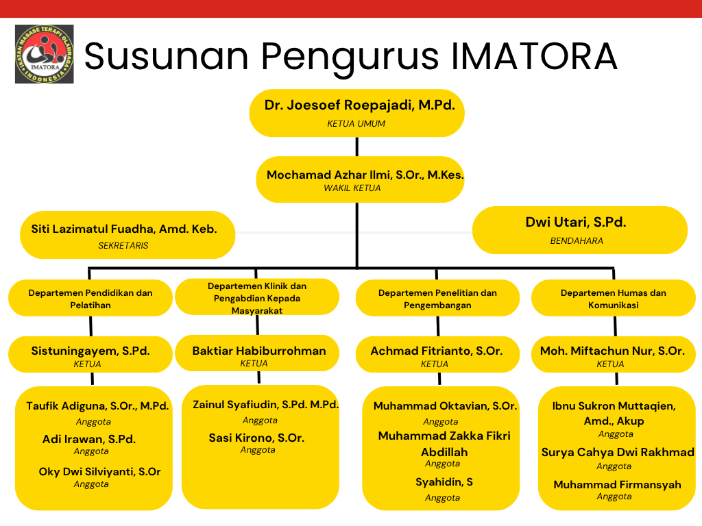 IMATORA hadir untuk membangun sistem pembinaan, pelatihan, dan sertifikasi yang terstandar, sehingga para terapis olahraga memiliki kompetensi dan etika profesi yang diakui secara nasional.